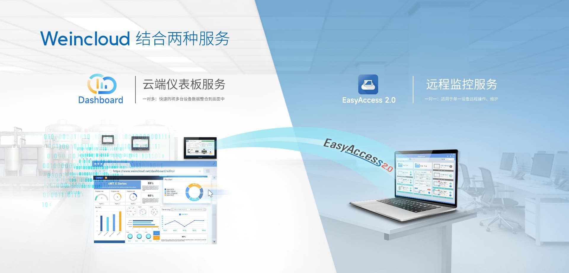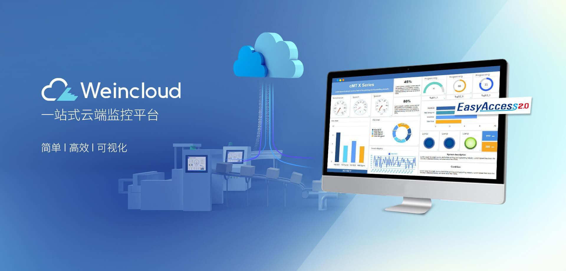 Weincloud 集結(jié)EasyAccess2.0遠(yuǎn)程監(jiān)控服務(wù)及Dashboard云端儀表服務(wù),將設(shè)備資料數(shù)據(jù)上云并以視覺化呈現(xiàn),協(xié)助管理者實(shí)時(shí)掌控現(xiàn)場(chǎng)產(chǎn)線狀態(tài)。